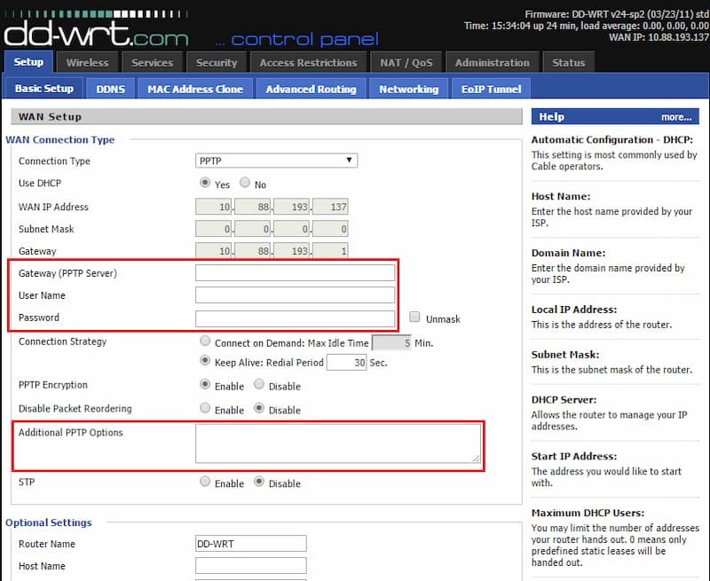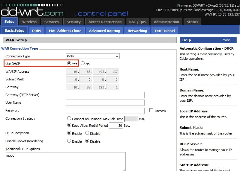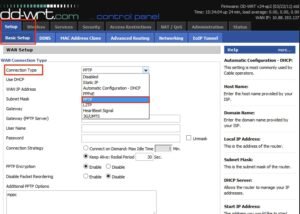 Step 2: Access the Basic Setup section in your DD-WRT router interface. A selection of options will be displayed. Choose PPTP from the Connection Type dropdown menu.