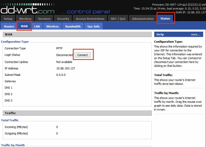 Step 6: Access the menu bar, select “Status,” and then proceed to the WAN tab. Select “Connect” to initiate a connection with your VPN provider.