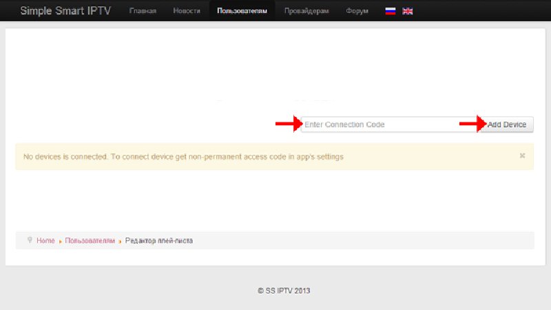 Step 4: Go to http://ss-iptv.com/users/playlist and enter the code you were sent. Then, click the “Add Device” button.